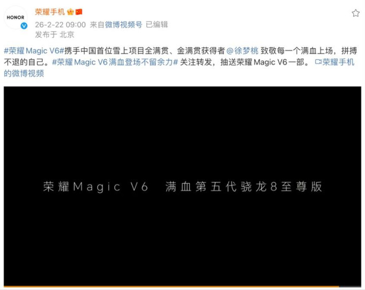此次荣耀邀请徐梦桃担任Magic V6的实力见证官,这位中国首位雪上项目全满贯获得者、米兰冬奥卫冕冠军,其“坚韧、突破、顶峰”的精神,与荣耀折叠屏的发展历程高度契合。